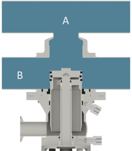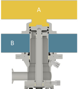 上阀轴中的中间密封件通过执行器的控制压在下阀轴上。首先,泄漏室L紧靠产品室关闭。然后,两个阀轴向下移动到打开位置。管道A和B之间的连接已建立。