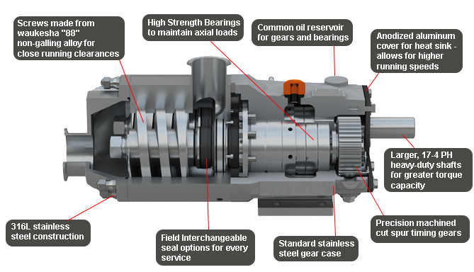 - 性能可靠,由Waukesha合金88非磨损材料制成的螺钉允许泵通过偶然接触运行,并降低螺钉接触时泵损坏的风险